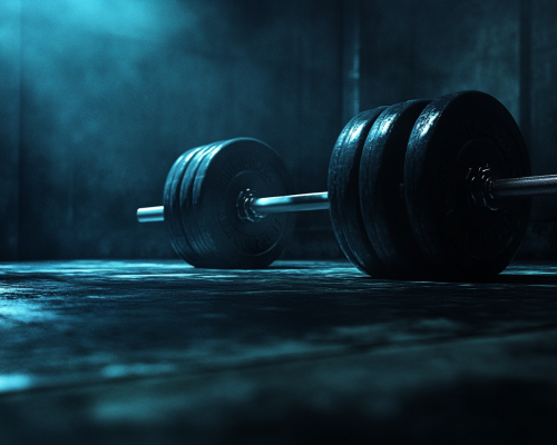 a very cool studio background image to be made into a big display. the feeling is moody but positive. the show is about weightlifting, strength, nutrition. be creative and make the colors grays, blues, reds. use spotlighting. show exercise but no people. make it very high resolution. photo quality. --ar 5:4 --v 6.1