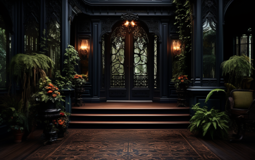 Create hyper realistic Halloween portrait of Victorian Regency Era home heavily decorated with spooky lighting and effects.