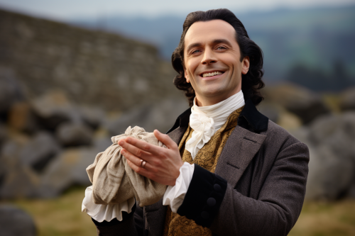 Character illustration of a anthropomorphic fox, as a Regency Era officer in the British Army, wearing a blue uniform, with a confident expression, dark hair and green eyes, broad shoulders and muscular build, rugged and handsome
