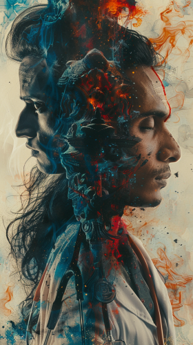 A close-up shot of an African man with deep wrinkles, his eyes wide open in fear and determination as he sits at the center stage. He is wearing traditional attire that reflects his cultural heritage. The lighting casts dramatic shadows on him from above, emphasizing his facial expressions. This portrait captures intense emotions, showcasing intricate details like sweat beads on his skin texture, and vibrant colors of his against a dark background. uhd. --ar 16:9