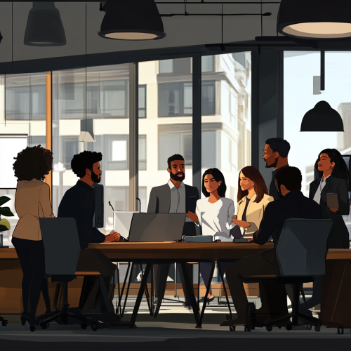 Generate a digital art for A digital art scene showing a diverse group of employees in a modern office setting, actively listening and engaging with each other. The background should be a sleek, contemporary office with large windows and natural light. Use shades of black for the overall color scheme, ensuring the scene feels professional and inclusive. No text should be present in the image. --ar 1:1