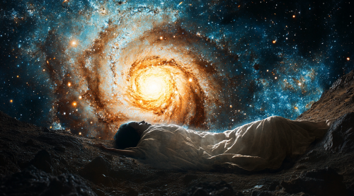 A cosmic image of a translucid soul sleeping in the middle of the universe. The image transmits quietness and peace while magnificient galaxies can be spotted on the background --ar 9:5