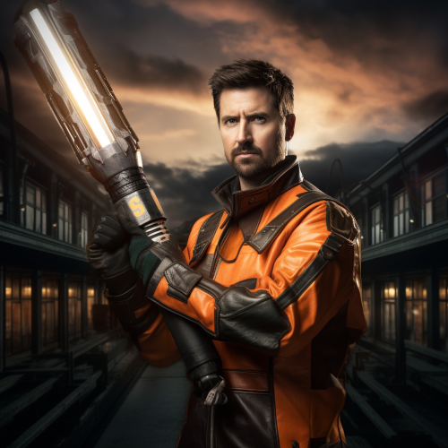 adam scott as half life character gordon freeman, holding wrench --c 25 --no glasses