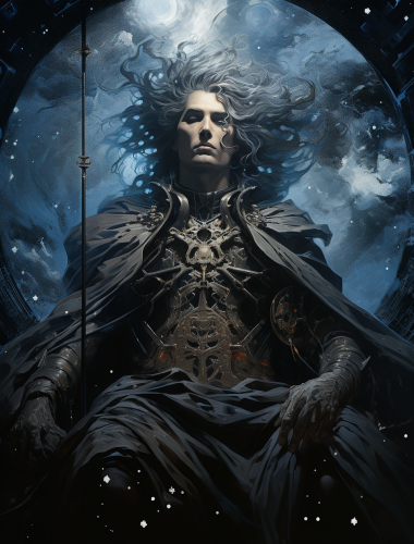 cronus the greek god sitting on a throne, starry galaxies in the background, in the style of trompe-l'œil illusionistic detail, dark silver and dark navy, luis royo, caspar david friedrich, screen printing, tivadar csontváry kosztka --ar 16:21 --s 250