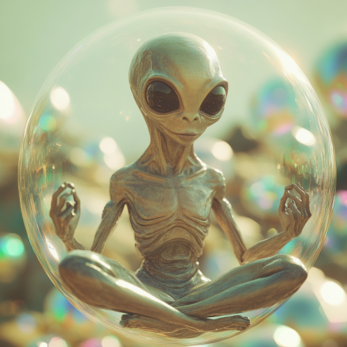 a realistic-looking alien with a sleek, metallic appearance, subtle greenish tint, and large expressive eyes, meditating inside a bubble, surronded by holographic bubbles, floating in boulder colorado