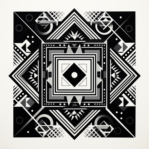 Generate an abstract line art piece filled with intricate geometric shapes inspired by mid-century modern design. Emulate the boho-chic style with a focus on organic patterns and neutral tones on dark background, architectural sightseeing city element s of Kuwait --no mockup --ar 16:9 --s 750