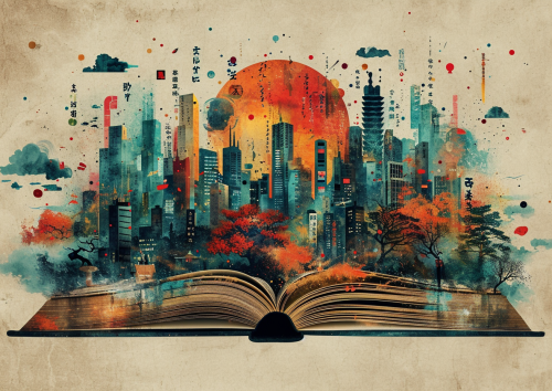 A Doctor's hat in the centre, Bright and sunny Colorful Ink painting in the Song Dynasty poster, Colorful Japanese retro poster, an image that beautifully blends academic atmosphere with the essence of creative industries. In the center, a large open book displays pages filled with elements from various creative sectors like music, film, art, and technological innovations. Surrounding the book are symbols of culture and creativity, such as musical notes, film reels, paintbrushes, and digital design icons. In the background, there’s a classic university campus, emphasizing the academic setting, complete with academic caps and gowns symbolizing the doctoral degree. The overall color scheme should be inspiring and bright, symbolizing the promising future brought by the fusion of creativity and academics --ar 7:5 --stylize 750 --v 6.0