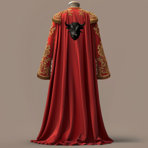 a sleek crimson matador's muleta. Gold embroidery on the sleeves. A simple black bull head embroidered on the back of the cape. Realistic Fantasy Art. Plain Background --no people