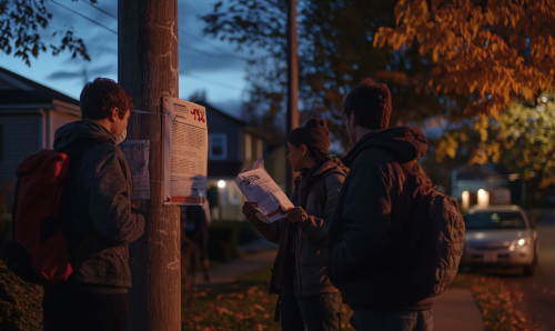 early autumn evening in a small town, an angled close-up on a diverse group of people examining a flyer posted on a telephone pole, visibly distressed at the news of an incoming health scare and a newly imposed curfew, ultrarealistic, 8k, cinematic focus --ar 5:3
