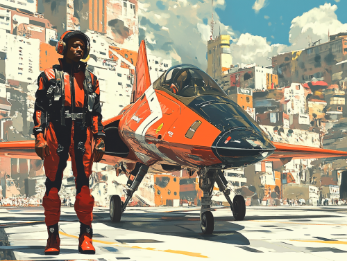 A vintage postcard showcasing a light starfighter, parked on a sleek, metallic tarmac. The pilot, an African American man with a cool, confident stance, is dressed in a stylish, retro-futuristic flight suit. The backdrop features a vibrant, utopian cityscape with streamlined buildings and neon lights, captured in a 1960s retro-futuristic style. --chaos 20 --ar 4:3 --style raw --stylize 200 --v 6.1