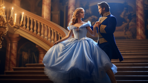 cinematic photograph. cinderella in a blue dress, long gloves, waltzing with a prince in uniform. In the background, a great ball in a palace with a magnificent staircase. warm colors. HD, detailed, ultra-realistic --aspect 16:9