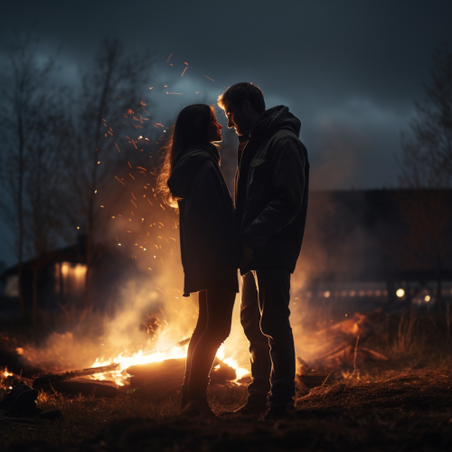 man and nice woman, couple of lovers, night, near the big bonfire, film stock, 100mm focal lenght, ultra wide shot, mist, film grain, ultra resolution, colors from retro poster