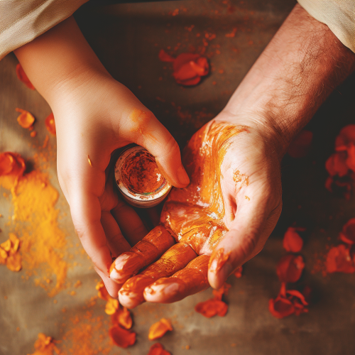 Hands of dad and daughter in a closeup making a New Year's card in warm colors, hyper-realistic photo, top view
