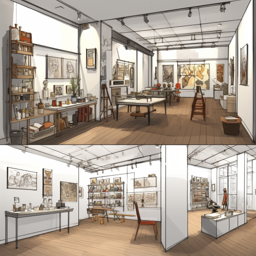 A shop three views of the art studio design, below a single room,double-storey, 5 meters wide, 15 meters long, 6 meters high, artistic style, reasonable layout,classroom, toilet, corridor, reception area, super Clear, Art Deco decor-- v4