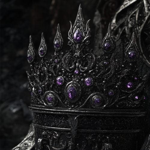 the location is a dark castle throne room, an up close view of the front of a large throne chair, the large throne chair is black and white with a dark wooden frame, on the the throne chair is a Silver King’s crown with amethyst, ruby, and howlite crystals embedded, and a pair of white headphones folding underneath the crown, and a tarot deck by the headphones