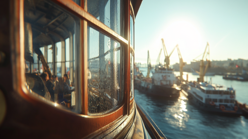The view from the wheelhouse: A harbor visible through the wheelhouse window, a clear sky filled with sunlight, and many people in the harbor, super realistic, UHD, future, Cinematic, Photography, Ultra - Wide Angle, Depth of Field, hyper - detailed, insane details, intricate details, beautifully color graded, super detailed, dynamic pose, photography, volumetric, ultra - detailed, intricate details, 8K, super detailed, ambient occlusion, volumetric lighting, high contrast, HDR, 8k --ar 16:9
