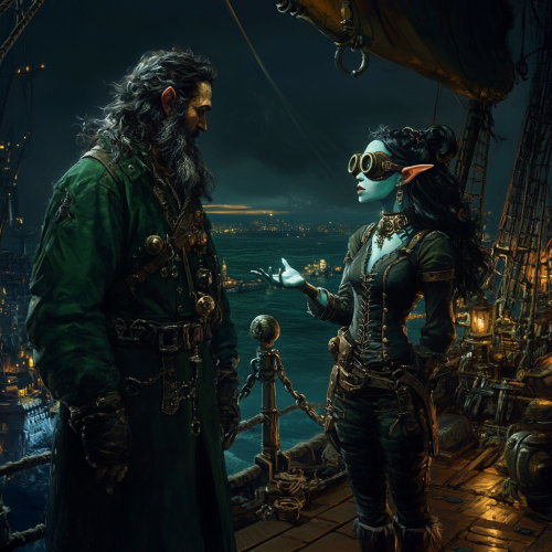 young lady dressed regarding fashion of beginning of 18 century is standing on the pirate sailing boat with scarlet sails. Near her is pirate captain. Film scene. Ultra realistic --v 6.1