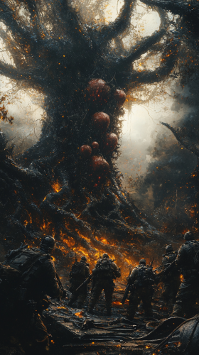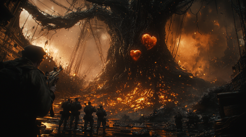 On the charred deck of a 100-foot ship, burned to a crisp, stands a massive, terrifying black tree. The tree's trunk is covered in golden vines, and its branches bear enormous red fruits resembling human hearts. A group of fully armed Marines, wielding rifles, stands nearby. The atmosphere is dark and ominous, captured with Rembrandt-style cinematic lighting, as if shot on an ARRI camera, creating an intense horror movie vibe --ar 9:16 --s 250 --q 2 --seed 594234596