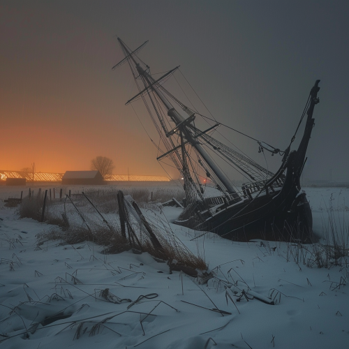 a anime drawing as black and white lineart of a old pirate ship in ocean while a storm is rustle up the water at dark night. a thunder is in background visible, creating slight highlights on the ship silhouette, wavy water, heavy storm, only the thunder enlit the scenery a bit --no blending colors, dithering, noise coloring --ar 16:9 --v 2