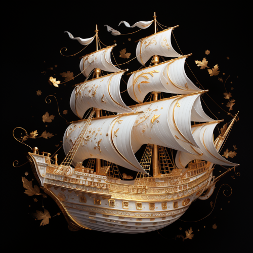 Birds eye view of a huge Magical golden and white windrush ship. Black background sparks flying