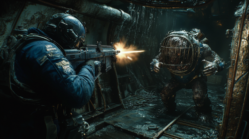 In an abandoned, charred ship cabin, an armed Marine in full combat gear fires his assault rifle at a terrifying figure standing before him. The creature is dressed in a tattered blue captain's uniform, with a grotesque head encased in an iron cage. Its hands feature unnaturally long fingers, each about 30 centimeters in length, with numerous knuckles. The scene is dark and frightening, with Rembrandt-style cinematic lighting casting deep shadows. The atmosphere is tense and eerie, captured like a horror movie still, shot with an ARRI camera, exuding a chilling and unsettling vibe --ar 16:9 --q 2 --s 200 --seed 594234596