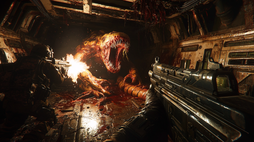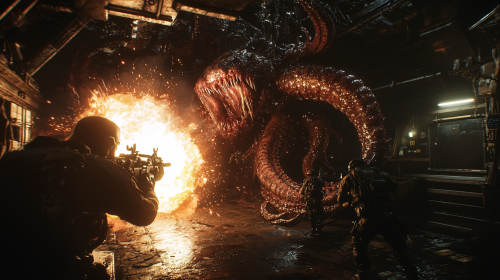 In an abandoned, charred ship cabin, a group of fully armed Marines, wielding assault rifles, open fire on a terrifying scene before them. On the ground, a massive, orange-and-yellow striped sea eel, covered in countless eyes, writhes violently as it constricts one of the Marines in its grip. The atmosphere is dark and terrifying, with Rembrandt-style cinematic lighting casting deep shadows. The scene is captured like a still from a horror movie, shot with an ARRI camera, creating an intense and horrifying ambiance --ar 16:9 --q 2 --seed 594234596