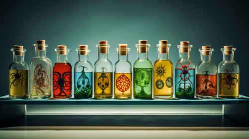 a laboratory where organ samples are found, with red fluids on the table and floor, where only a small lamp gives light, a dark environment, hyper realistic, high res, 8K, 35mm lens, dslr camera --ar 3:2