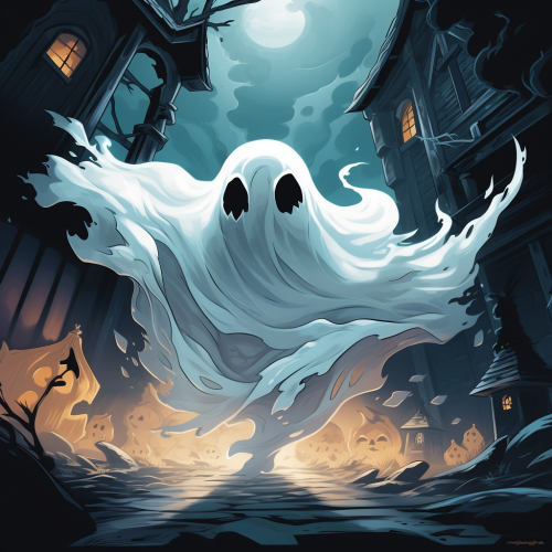 painting style, textured. spooky feeling. dark and dull colouring. basketball court. white halloween ghost standing in basketball court. spooky --ar 16:9