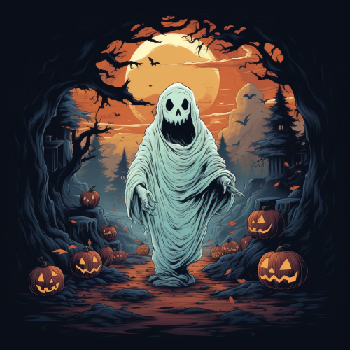 2D, halloween atmosphere The foreground and surroundings are filled with orange jack-o'-lanterns of all sizes. A big sheet ghost in the middle raised his hands and occupies 1/2 of the screen, The background is dark There is moonlight and bats and occupies 1/6 of the screen