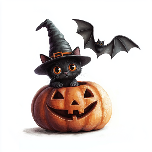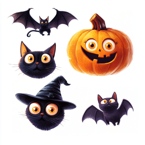 five funny halloween objects, carver pumpkin with disney eyes and black cat, witche's hat, old scary black cat, cute flying bat with , realistic and creepy, isolated on the white background, cartoon, pixar character, white background --v 6.1