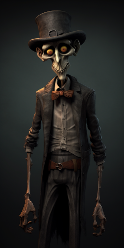 Character design, pixar style, 3d model, thin creepy man, halloween style, older, mysterious, undead, cartoon, --ar 2:4
