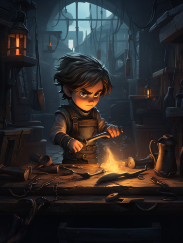 cute cartoon blacksmith forging a knife, dark and creepy background, --ar 3:4