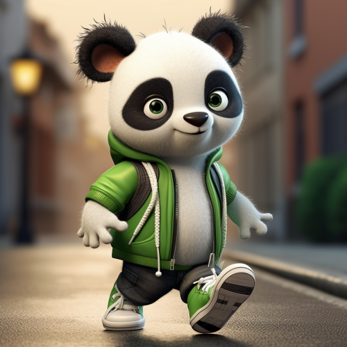 panda 3D, cartoon feature, skinny arms and legs, wearing sneakers, Pixar, Rango, cute, Toy Story style, cute, shy, hyper detailed, vray, cold light, cartoon style