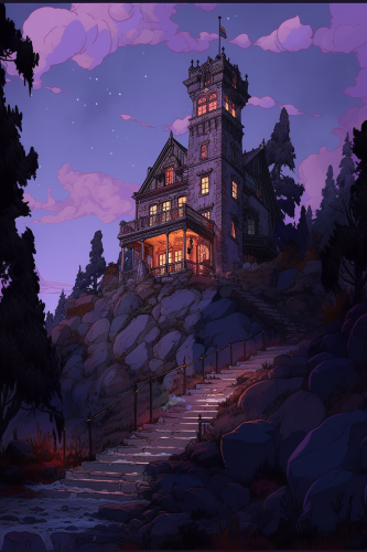 a house on top of a hill with waterfall flowing down the hill in the middle of a magical enchanted forest, night time, HD, 8K --ar 16:9