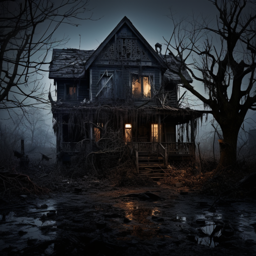 eerie scene, witch house on fire, minimal, painting, vintage, worn, creepy, solemn, andrew wyeth, very dark colors, thick paint, Jeremy Miranda, stephen gammel feel, sergey kolesov