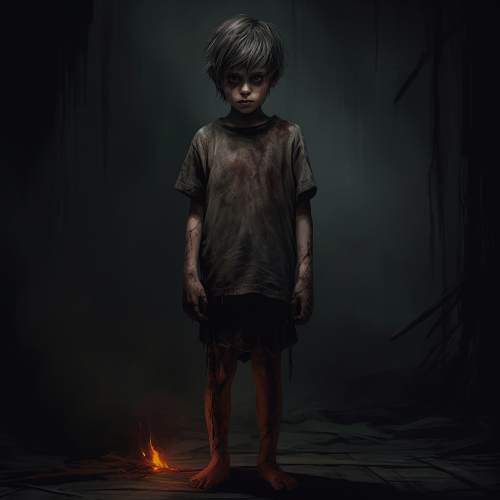 A bunch of creepy children 7 years old in my face, all wearing red t-shirts, inside a dark creepy train, no eyes, dark black eyes, evil looking children, starring right at me, dark dim lighting, 35mm lens, f/1.8 --ar 9:16 --v 6.0