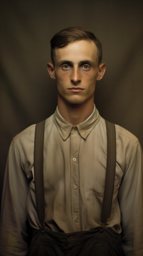 29 yr old man whos wearing a shirt from the 1930s portrait creepy photo --ar 9:16
