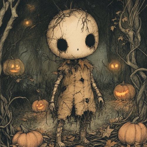 An eerie, whimsical illustration inspired by Edward Gorey, featuring a small, doll-like scarecrow figure with hollow eyes and stitched, skeletal features. The character stands still, wrapped in tattered leaves and threads, exuding both innocence and unease. The scene uses detailed cross-hatching to capture the textures of the decaying fabric, wooden limbs, and the twisting vines that entangle the figure. In the background, glowing jack-o'-lanterns flicker faintly, casting long shadows over the damp ground. The minimal background leaves much in darkness, with only faint shapes of branches and distant pumpkins to hint at the surrounding environment. Symbolic elements, such as a stray leaf or a small, broken clock, subtly emerge, enhancing the story’s mysterious mood. The composition strikes a delicate balance between playful and unsettling, staying true to Gorey’s signature blend of the whimsical and macabre.