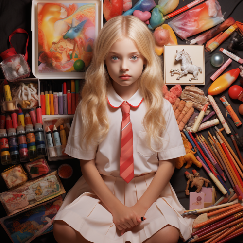 create a doll that is a hyper-realistic image of a 4-year-old girl with a Cuban school uniform, red skirt and white shirt, long blonde hair, with a pink lunchbox with a unicorn, and drawing with crayons-- title --v 5.2 --s 250