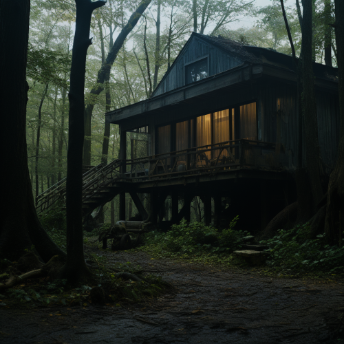 ultra realistic 4k, youtube thumbnail size. Outside view of an abandoned house, in an overgrown wooded area. Brick house. Murky windows. Run down. Creepy. Eerie.