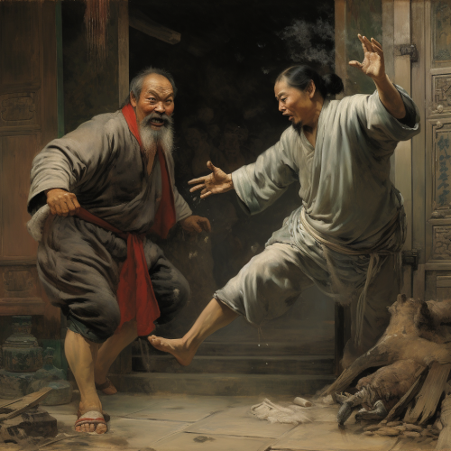 disney pizar style, a skeleton wearing a cowboy hat is holding a golden trophy in one hand and a chainsaw in the other hand, his creepy house in the background is covered in spider webs, the neighoring house has an angry witch looking out of the upstairs window, --ar 18:11