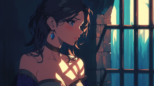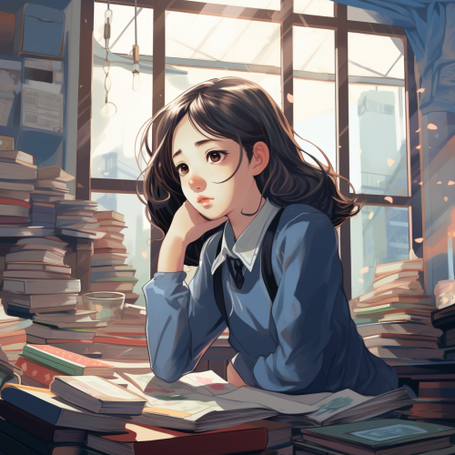 a Chinese female middle school student wearing glass sitting on her chair in the classroom, she is looking out of the window, on her desk are piles of books, in 2D style