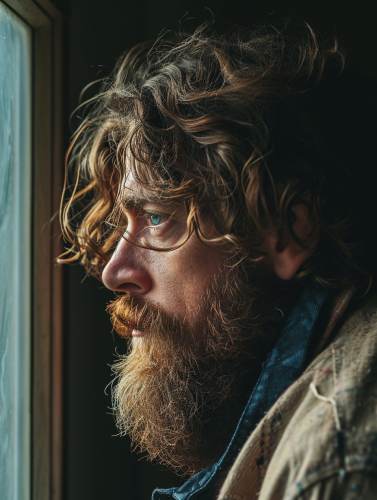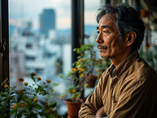 Japanese man looking out window, clean office --v 6.0 --s 400 --ar 4:3