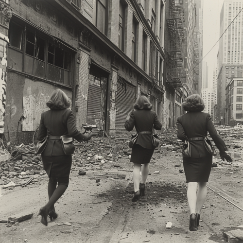 female detectives responding to a crime scene on a city corner, helmut newton photograph, 1979 --relax --chaos 15 --s 350 --v 6.0 --style raw