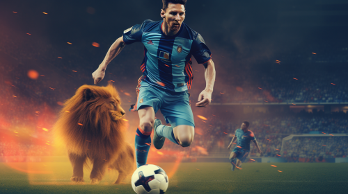 Lionel Messi is dribbling past the lions that surround him. Surrounded by the atmosphere of a football field people cheering In an atmosphere of intense fighting colorful sky 8k, --ar 16:9