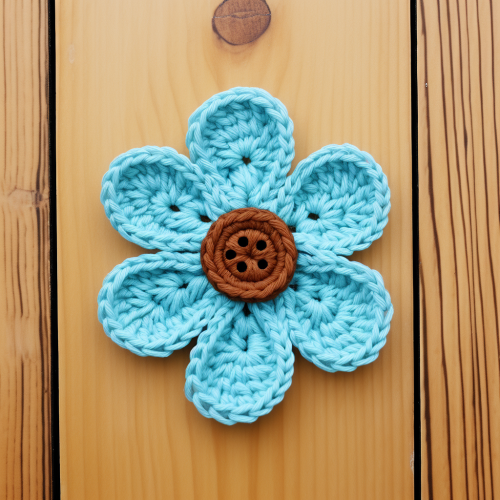 a crochet flower in sky blue yarn, handmade with a button centre, on a wooden brown background