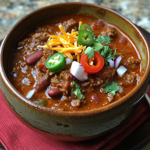 Snap a 4K photo that's super real and makes you hungry right away. Picture a big white crockpot on a simple white table. It's filled with a hearty chili that's got chunks of beef stew meat and browned ground beef, all cooked together. There are also diced onions, bell peppers, chopped zucchini, and mushrooms in there, making it colorful and full of veggies. Garlic, tomato sauce, fire-roasted tomatoes, and green chiles add tons of flavor, and beef broth keeps it all moist and yummy. The chili is spiced just right with salt, pepper, oregano, lots of chili powder, and cumin, making it smell amazing. Imagine this crockpot full of chili, ready to be served with your favorite toppings like onion, avocado, cilantro, and jalapenos. It should look so warm and inviting, you'd want to grab a bowl and enjoy a hearty serving right from the photo. --ar 2:3