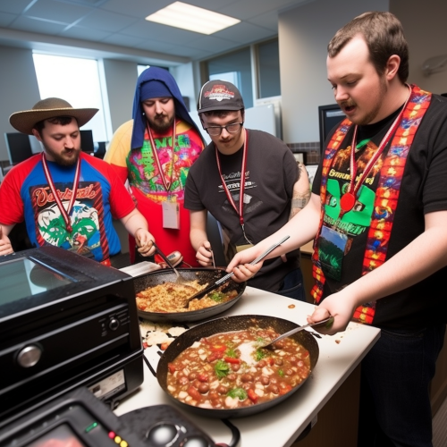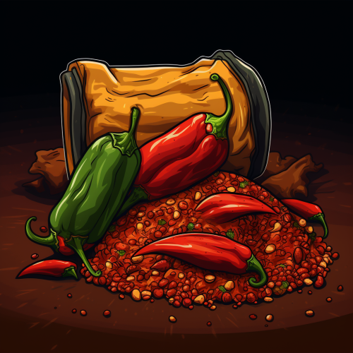 "Chili Cook Off" poster, Red Chili pepper wearing a cowboy hat, Bright colors, red brown, yellow black, orange. Type says, "Chili Cook Off", 2:3 ratio --q 2