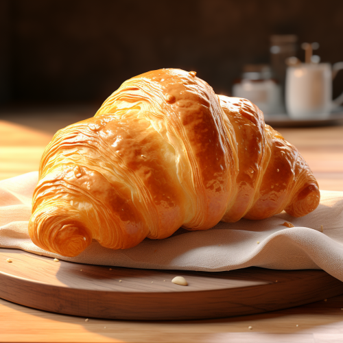 A golden-brown croissant rests on a weathered wooden table in a sunlit Parisian café. The pastry's flaky layers are visible, creating intricate patterns across its crescent shape. Soft morning light streams through a nearby window, highlighting the buttery sheen on the croissant's surface. Tiny flakes of pastry surround the croissant, hinting at its delicate texture. A steaming cup of café au lait sits beside it, its aroma mingling with the scent of freshly baked goods. The croissant is perfectly centered in the frame, with a shallow depth of field blurring the background of the quaint café interior. The style is reminiscent of classic food photography, with a touch of rustic charm. Close-up details reveal the croissant's airy pockets and tender interior, visible through a small tear in its side. A pat of softening butter and a jar of apricot preserves complete the scene, adding pops of color and suggesting the impending moment of indulgence.