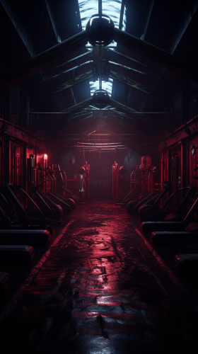 man asleep in bed, bed is in the middle of busy crowded gym setting, high angle shot, ar 9:16 --v 6.0 --s 750